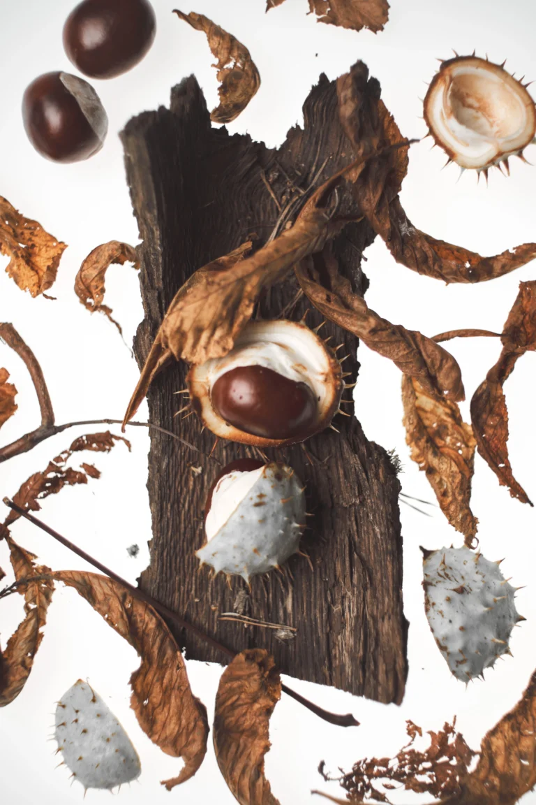 The natural objects, conkers and forest-floor elements, came first. Clean white backgrounds kept compositions focused on the focus fall off. Introducing plastic packaging into these organic compositions added “meddling”, representing humanity’s inevitable interference with nature.