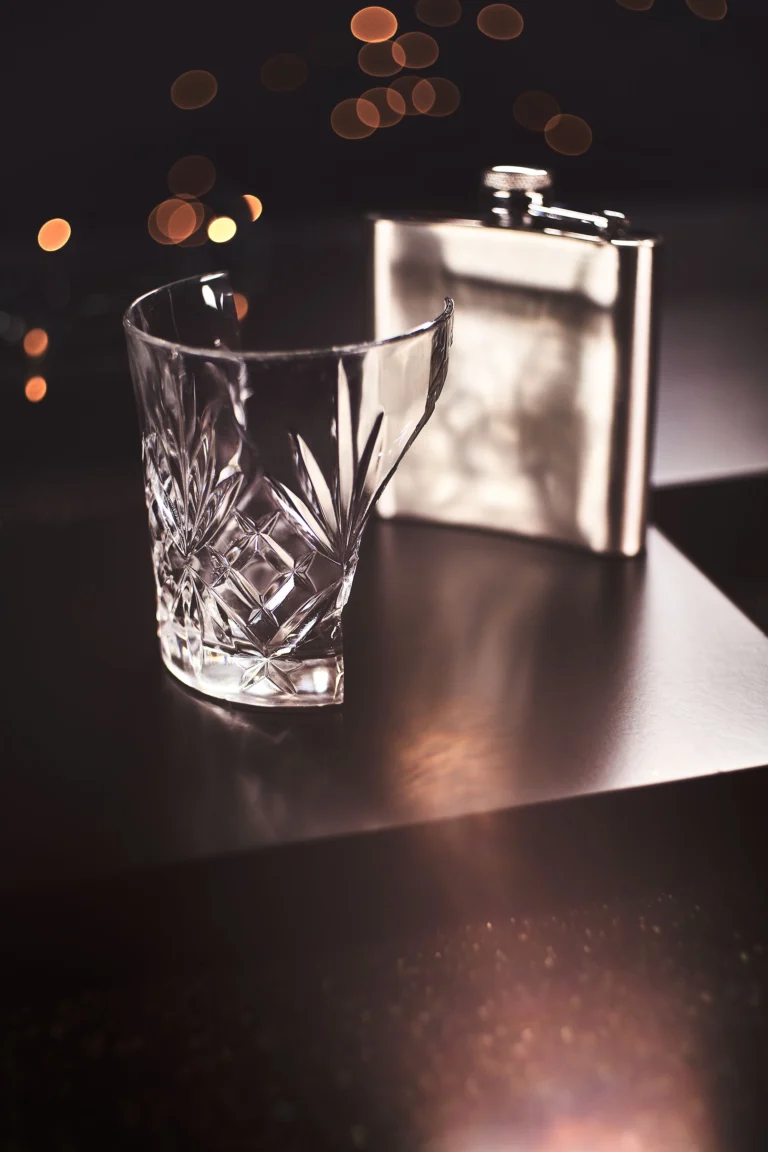Broken glass and flask follow, mixing up the object materials, with harder light flaring off metallic surfaces and minimalist fine glass detail. Bokeh is introduced. There is a deliberate blend of texture, light and smooth tone to provide a multitude of interest and eye movement. In camera flare breaks up tone and shifts colour. The broken glass was a fortunate accident before the shoot. It’s not meant to be a commentary on anything, however there is something unsettling about a sharp edge. Be careful.